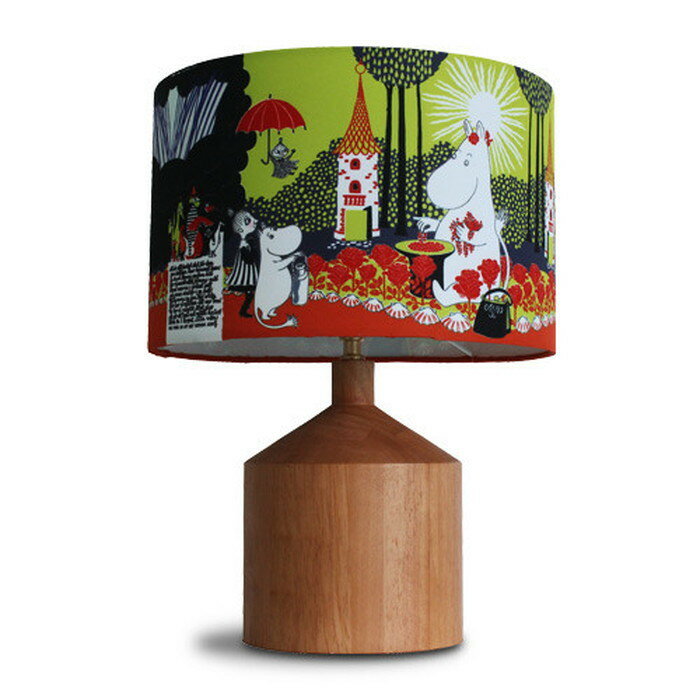 【ムーミン谷の切り株】物語のワンシーンが描かれたシェードと、切り株のような天然木のベースを合わせたテーブルランプ。